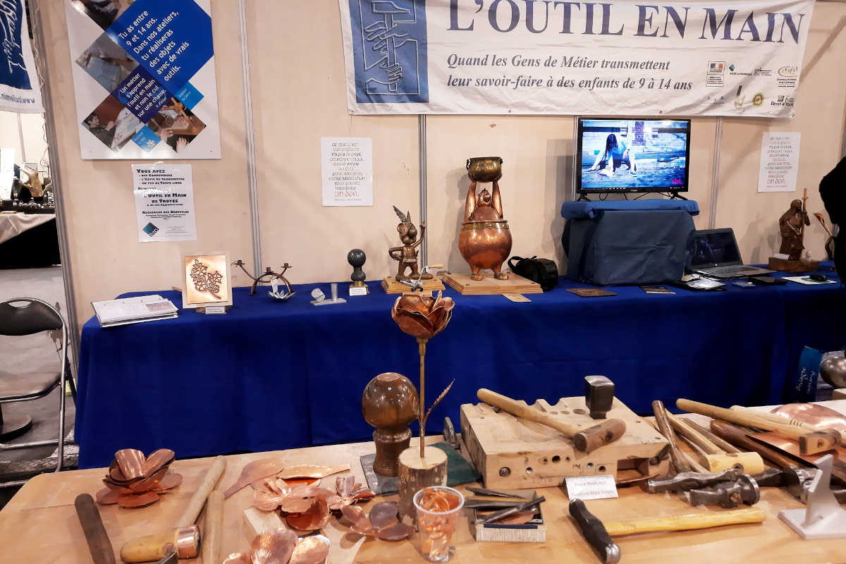 Sur 750m2, l’exposition « Au fil du métal » présentait quelques aspects des métiers du métal avec, outre les artistes présents qui exposaient leurs créations, la Maison de l’Outil et de la Pensée Ouvrière, le Musée des Vieux Coqs ainsi que l’Outil en Main de Troyes.