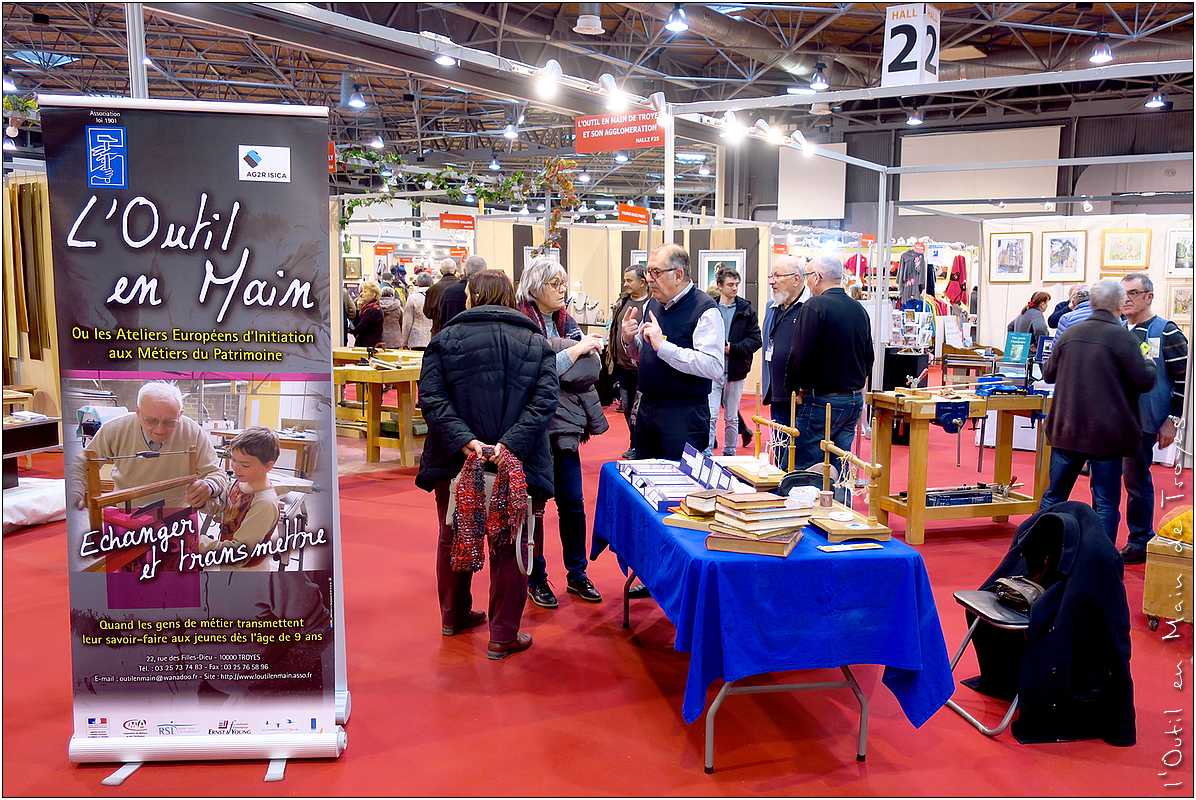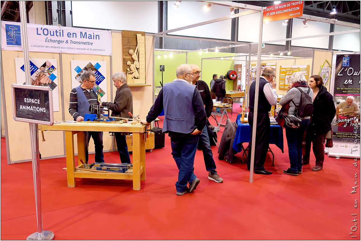 Sur notre stand, les bénévoles et animateurs des ateliers de l’Outil en Main de Troyes présentaient nos activités alors que les enfants pouvaient s’exercer à l’art du vitrail Tiffany, à la reliure, à la sculpture sur bois, au tissage, au cannage, à la couture,...