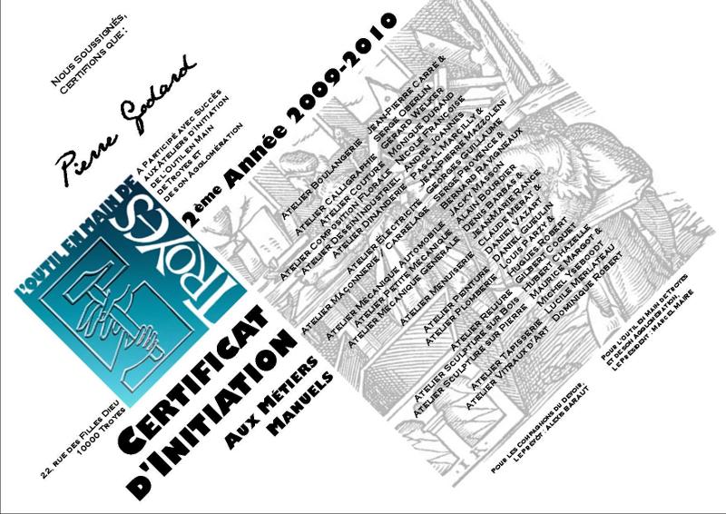 La cérémonie de remise des Certificats d’Initiation aux Métiers Manuels de l’année 2009/2010 s’est déroulée ce mercredi 23 juin 2010 à la Maison des Compagnons de Troyes. Une petite centaine de personnes avaient répondu à l’invitation. Mmes Elisabeth PHILIPPON, adjointe au Maire de Troyes et Martine GILLET, directrice des affaires sociales de la ville de Troyes étaient excusées.