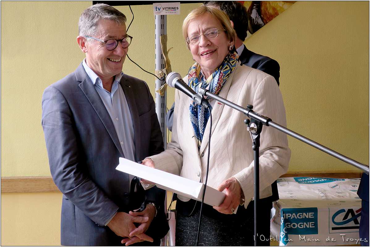 Mme Élisabeth Philippon a remis un cadeau souvenir à Mr Lehebel, au nom de la ville de Troyes, ville où est né le concept de l’Outil en Main en 1987.