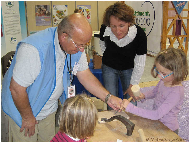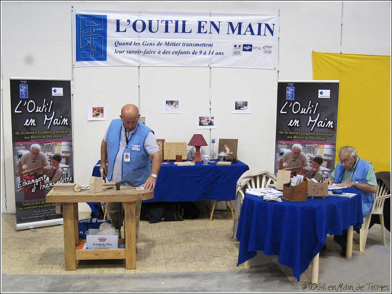Les femmes et hommes de métier ainsi que les bénévoles des Outil en Main de Ste-Maure et de Troyes & son Agglomération ont ainsi pu accueillir [1] les visiteurs sur leur stand. Des démonstrations de menuiserie / ébénisterie, auxquelles participaient les enfants, ont animé le stand.