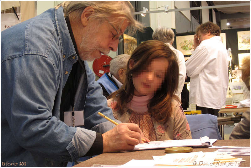 Dominique, Étienne, Gérard, Gilbert et Michel ont animé le stand en faisant partager leur métier/passion aux visiteurs. Les plus jeunes ont pu s’exercer en maniant le coupe-verre avec la vitrailliste, le ciseau à bois avec l’ébéniste, le calame avec le calligraphe, le cousoir avec le relieur ainsi que la pointe et la massette avec le sculpteur sur pierre.