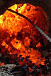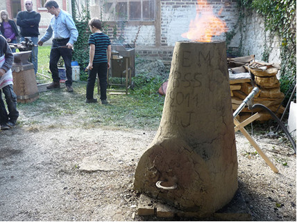 Invités à nous rendre dans la cour du bâtiment d’accueil, nous découvrons une forge puis une masse brune faite de briques et d’argile, branchée à un gros aspirateur. Des flammes vives sortent de l’ouverture pratiquée au sommet, utilisée pour le remplissage. Le bas fourneau.