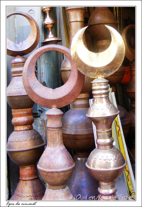 Les échoppes sont complémentaires. Chacune confectionne un élément spécifique de l’objet final. C’est le cas dans la fabrication des épis fixés au sommet des minarets [1], composés de trois boules et d’un croissant de lune.