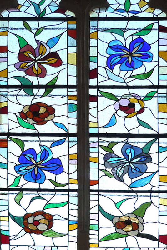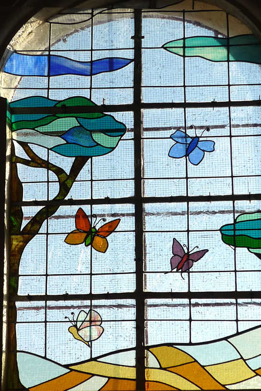 Le portail franchi, étonnement ! Nous sommes bluffés par cette pauvre petite église usée par les années et sans entretien. Un bain de lumière et de couleurs. Des vitraux neufs ici ! Ce qui me frappe d’emblée ce sont les verres utilisés, semblables à ceux que j’ai découverts à l’atelier vitrail Tiffany de l’Outil en Main : du transparent, translucide, bariolé, iridescent… Je n’en avais jamais vus de tels dans une église. Sur l’un des vitraux, le maître verrier a réalisé un assemblage heureux, utilisant des morceaux de l’ancien dans une composition contemporaine. Sur d’autres, nuages, papillons, fleurs et rosaces. L’ensemble est surprenant, harmonieux, lumineux et gai. C’est une renaissance pour cette modeste église ; mais il y a tellement à faire à l’intérieur pour la rendre à peu près accueillante.