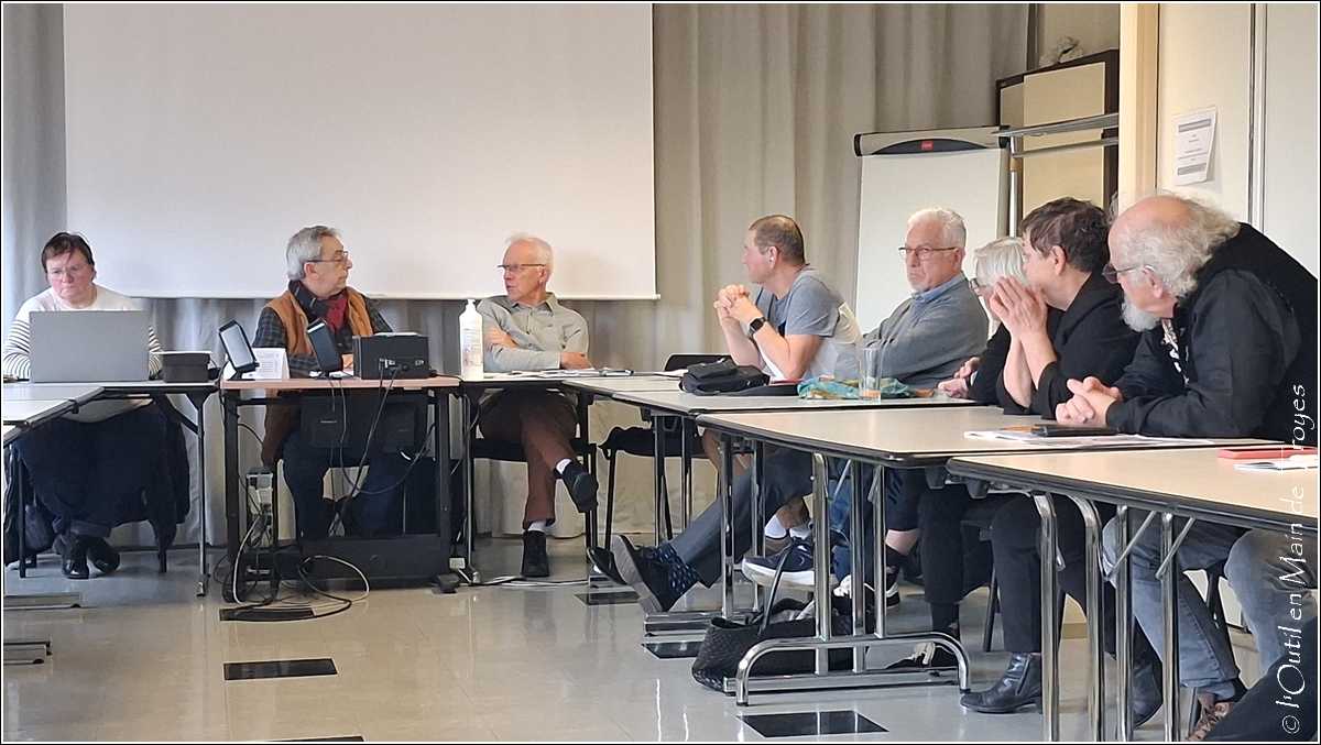 Après la présentation des nouveaux bénévoles : Ana , qui depuis la rentrée de septembre est venue renforcer les ateliers Tissage et Tapisserie/Cannage et Alain , qui va animer à partir de janvier le nouvel atelier Origami, le Président a donné la parole à Gilbert COUSIN, nouveau délégué territorial pour la Champagne-Ardenne, qui a présenté ses missions au sein de l’Union des Associations l’Outil en Main.